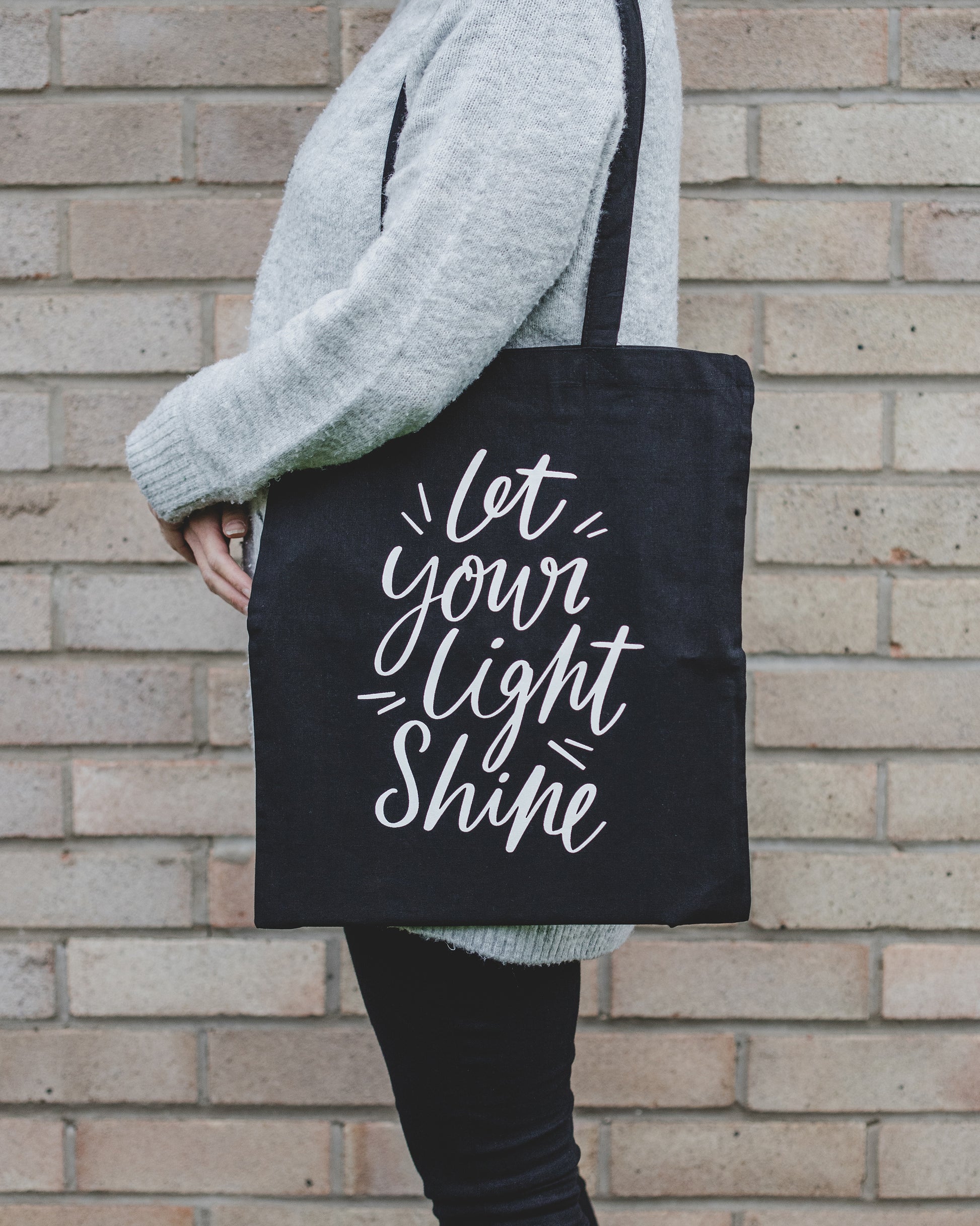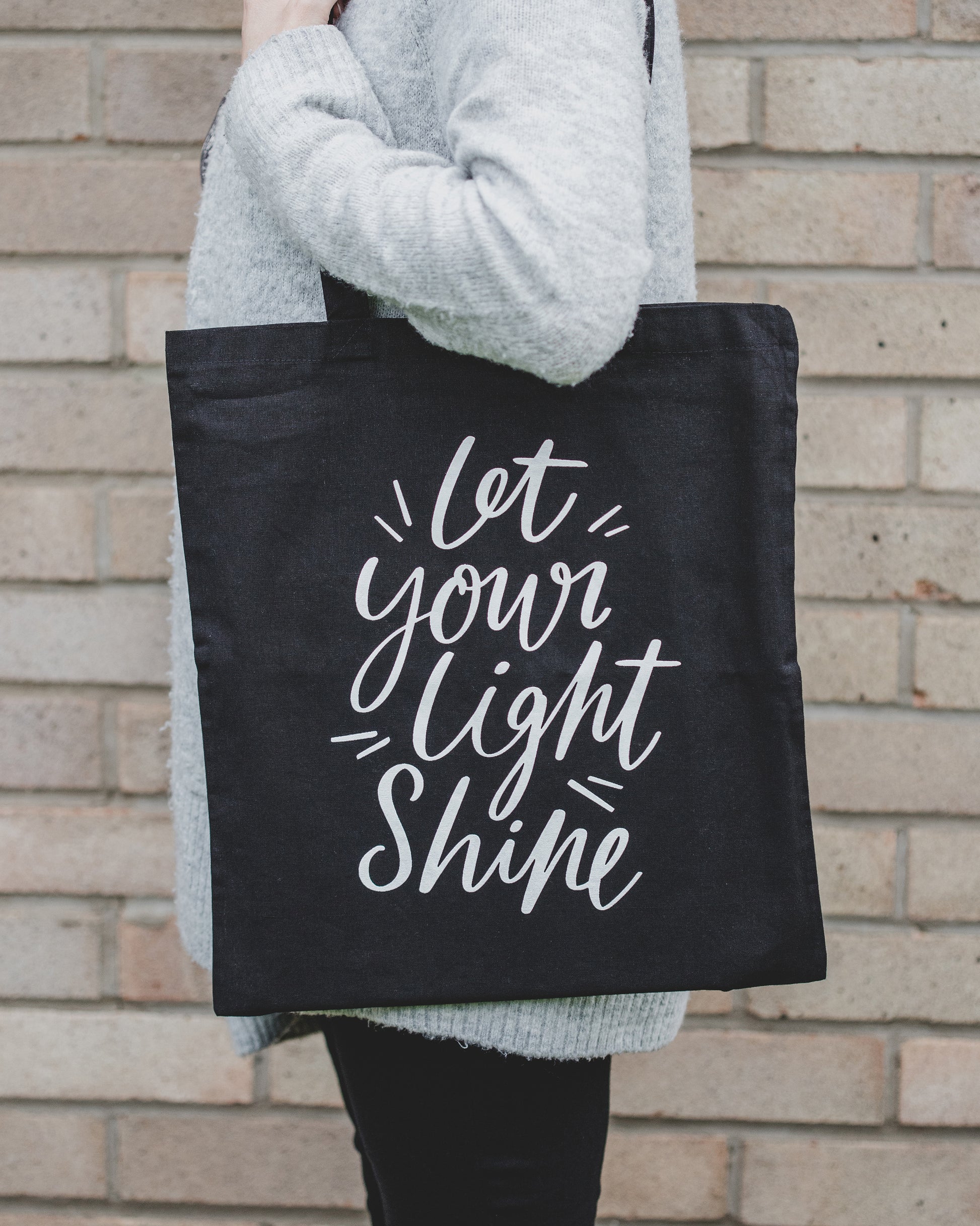 These 100% cotton black tote bags feature a hand-lettered design screen printed in white, with the words "Let your light shine," taken from Matthew 5:16. A great sustainable replacement for your plastic bag, it would make the perfect gift for a friend or yourself!